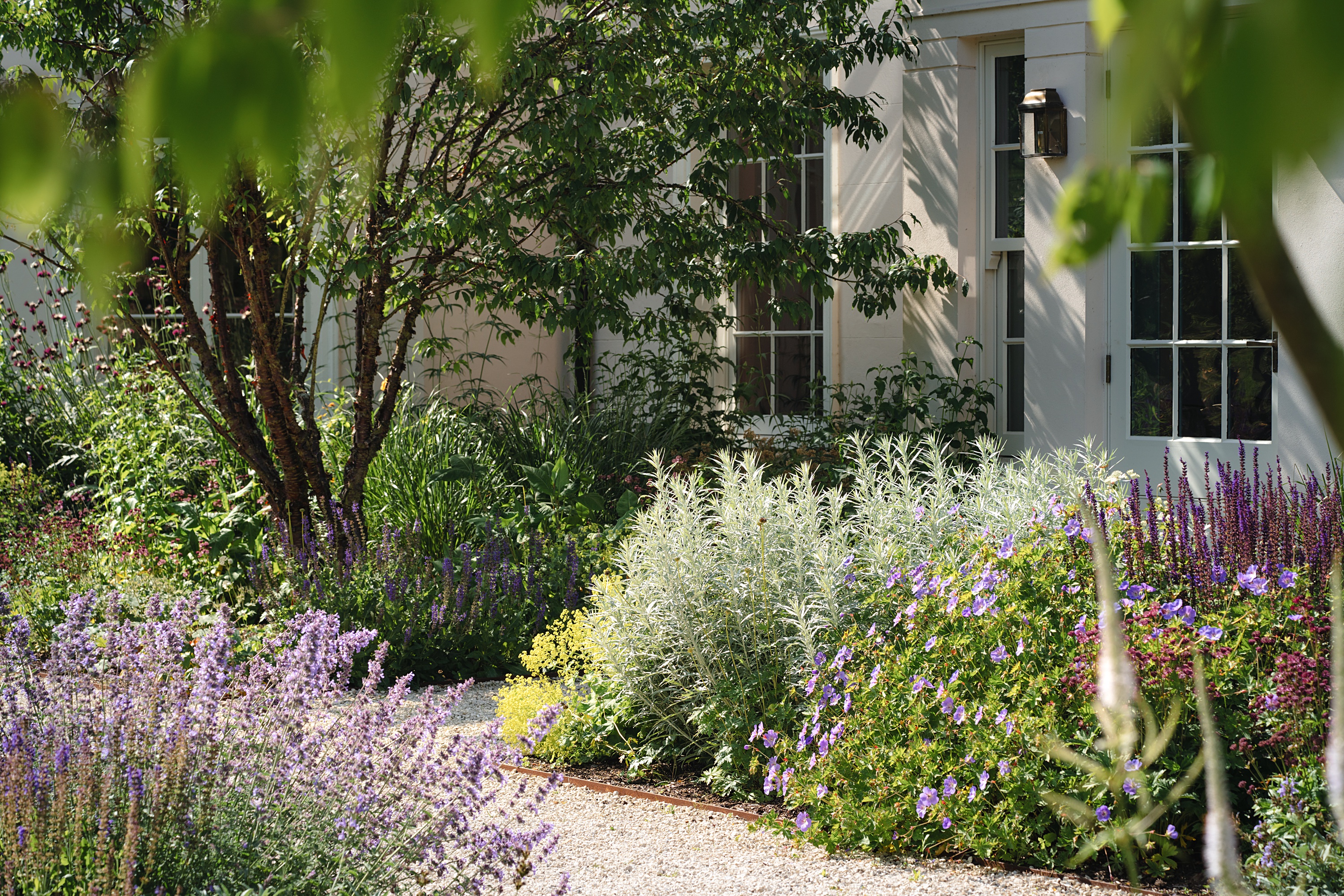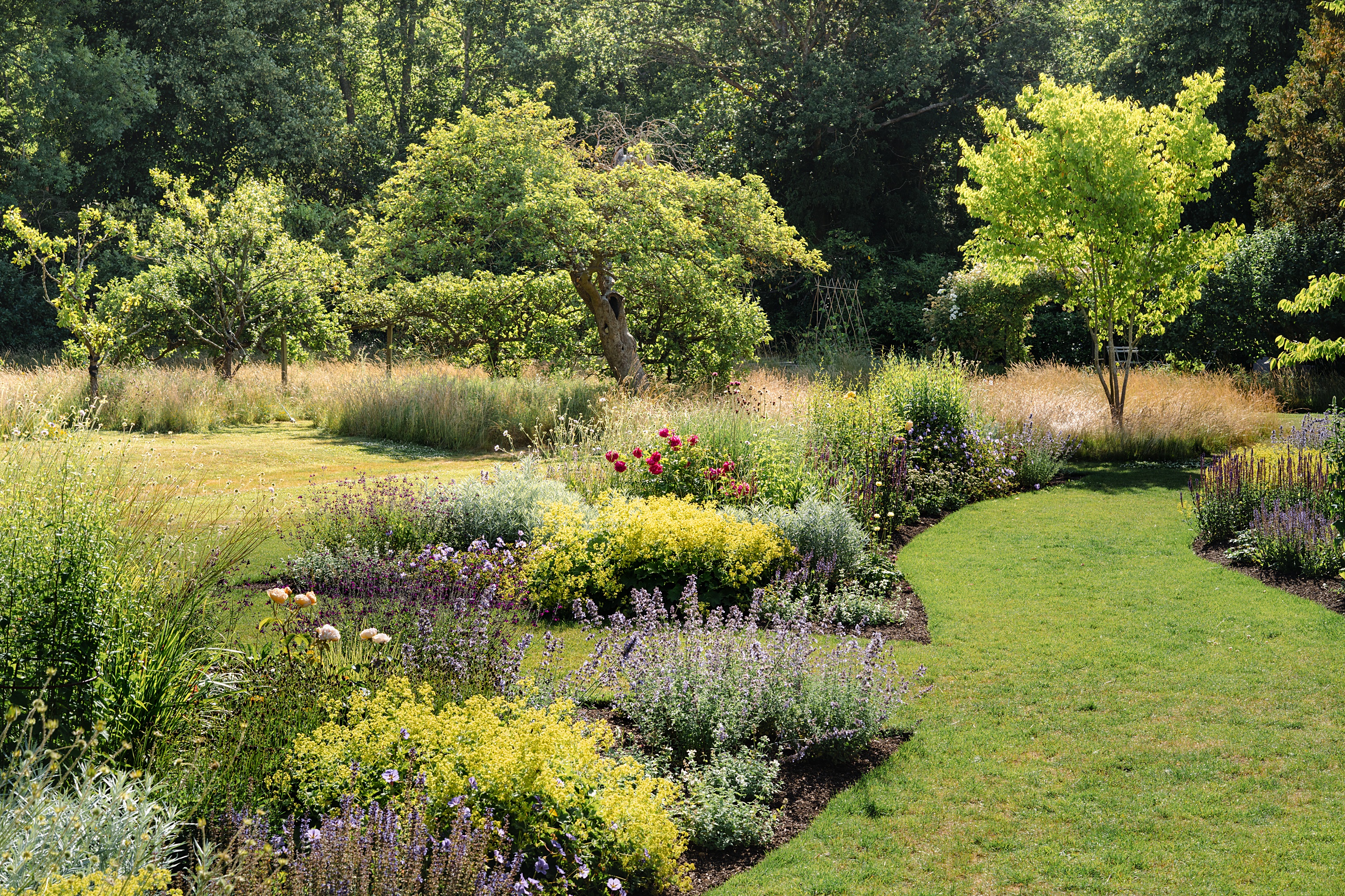 At the heart of the garden lies a wide, contemplative ornamental space visible from many rooms of the house. Deep, lush borders unfold in layered palettes that shift throughout the year, from early seasonal structure to abundant summer texture and autumnal warmth. Multi-stem trees punctuate these borders, creating an intermediate canopy that bridges the garden’s abundant planting with the surrounding woodland and mature boundary trees.
