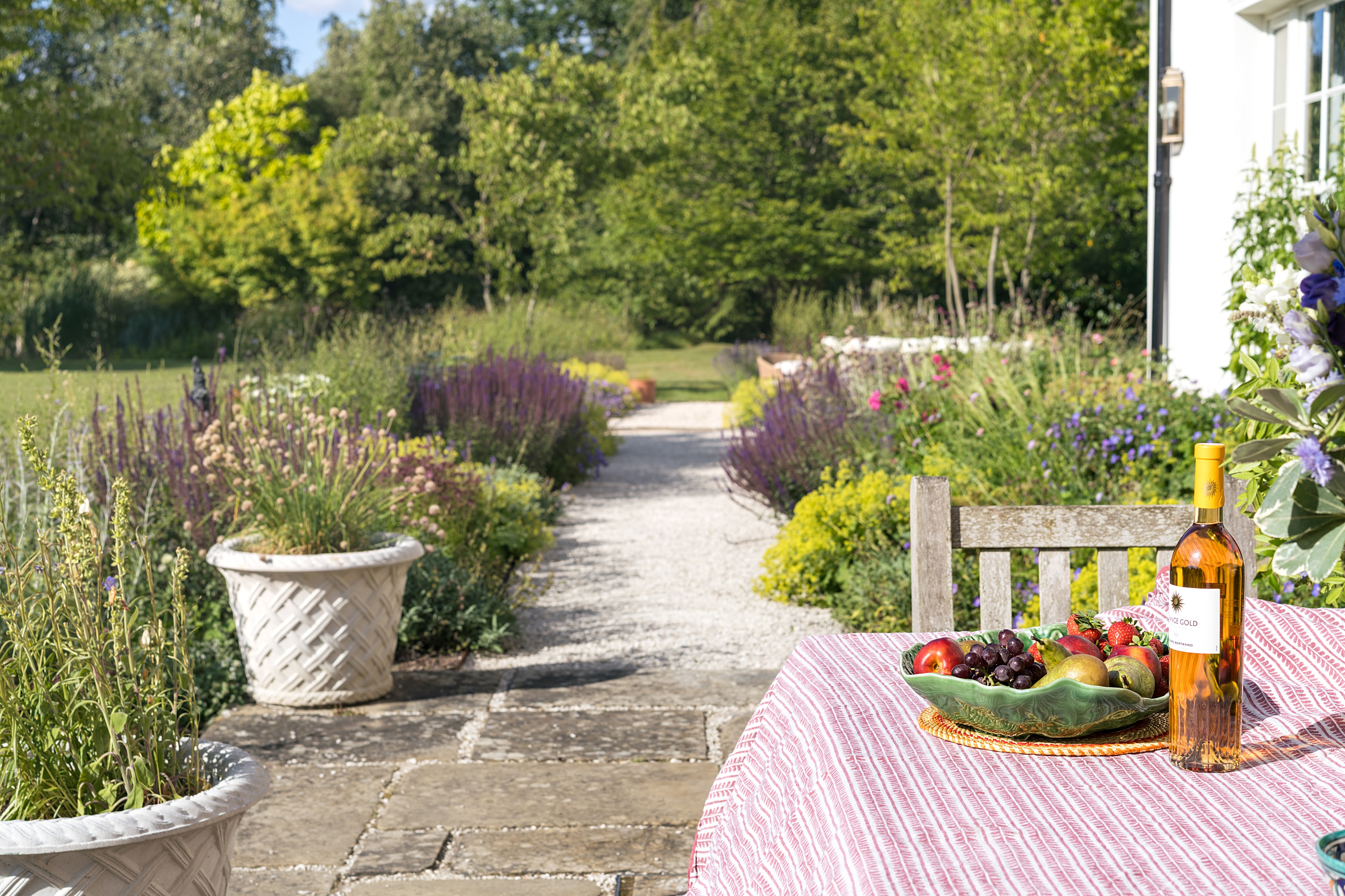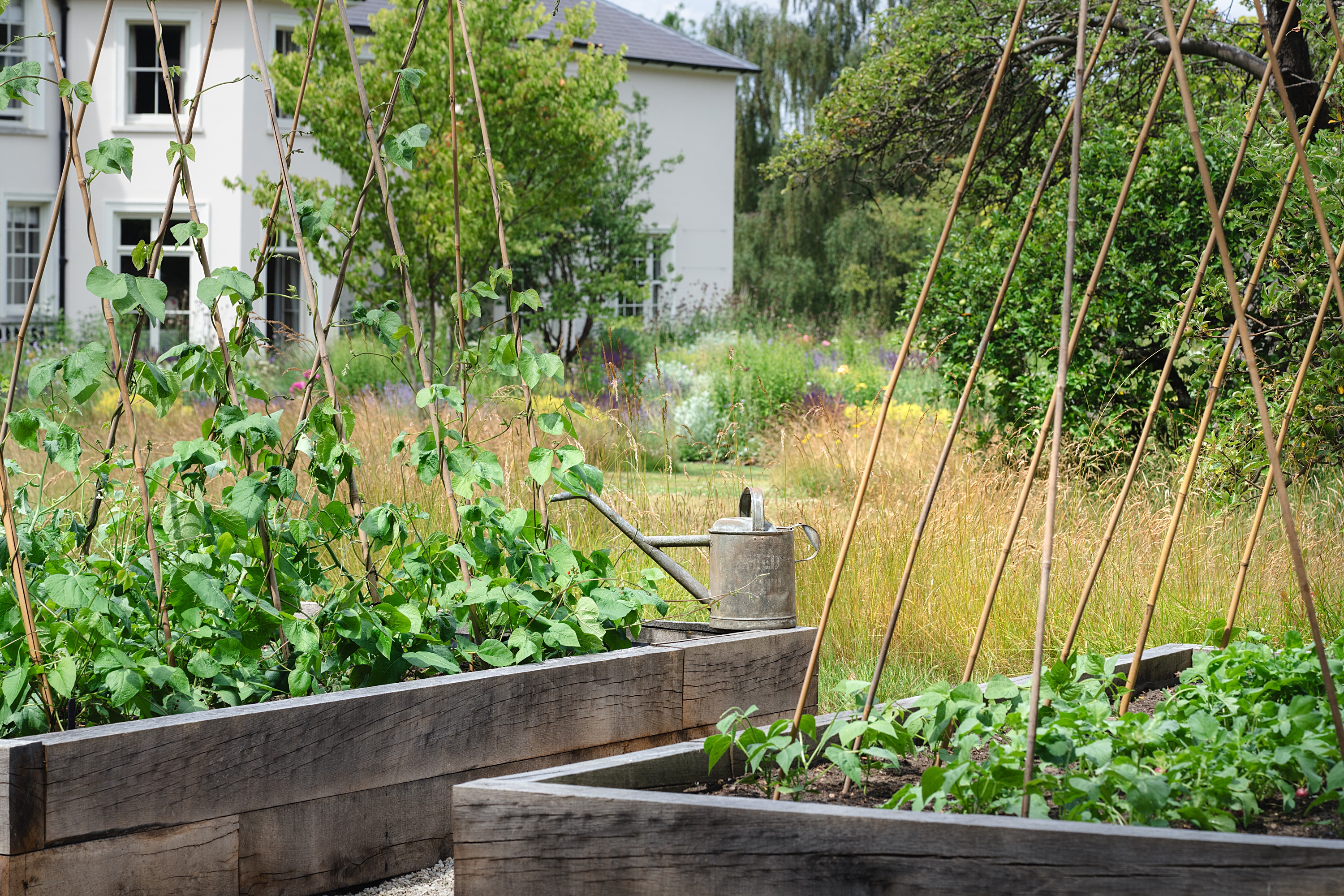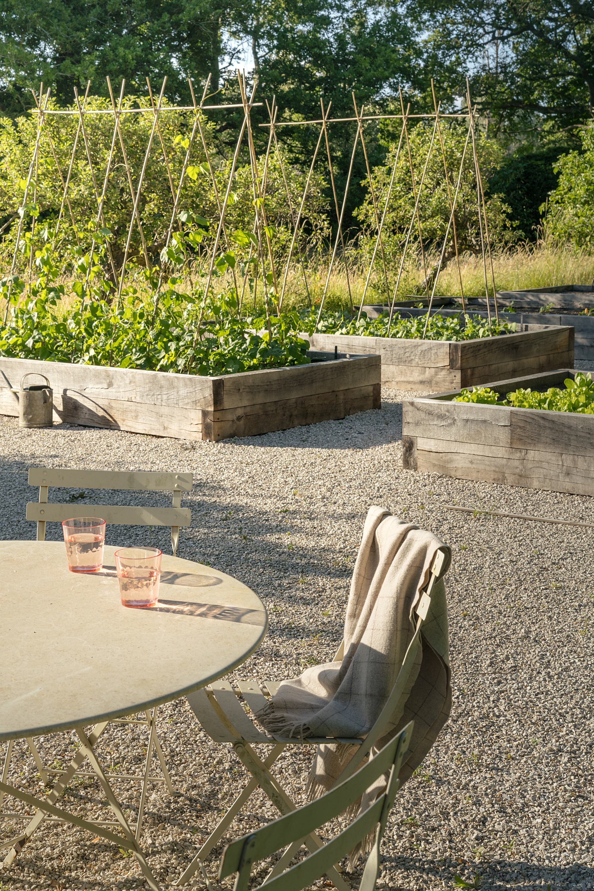 A series of distinct yet interconnected garden areas now weave through the landscape. A new vegetable garden and orchard - home to magnificent old pleached apple trees - reintroduce seasonality and productivity. Lounging, play, and dining spaces are positioned according to sunlight and the architectural lines of the house, ensuring every area feels purposeful and naturally placed.