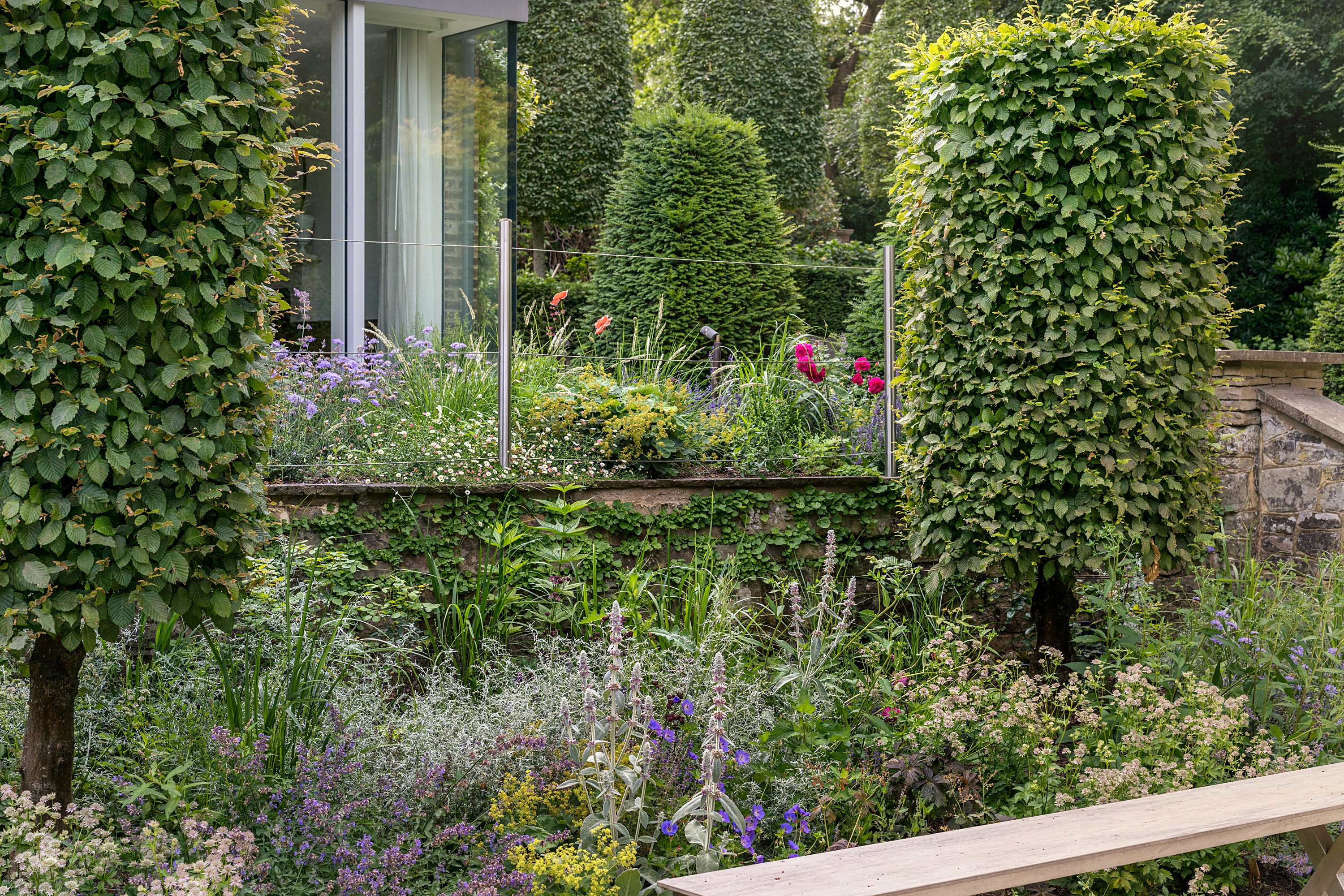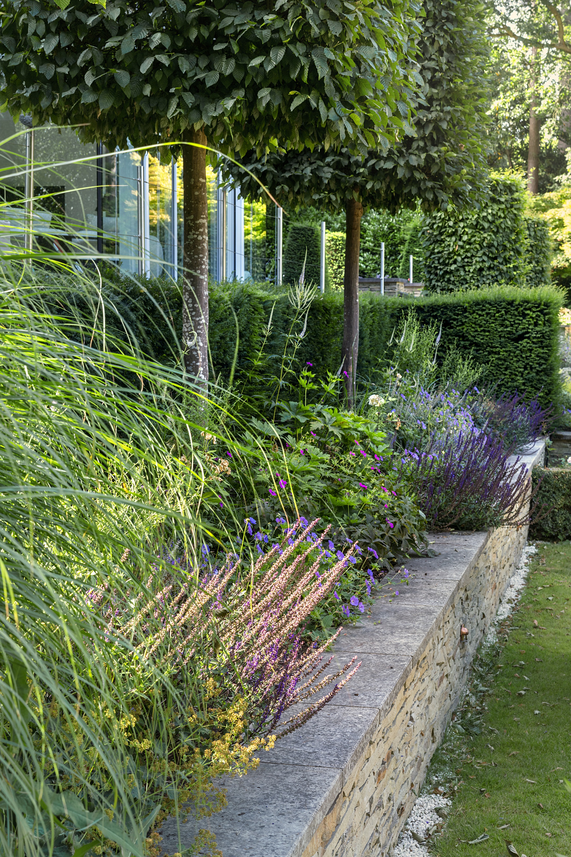 In contrast, the more intimate zones - terraces, resting spots, and south-facing gardens - were redesigned with planting that invites contemplation, softness, and seasonal nuance. Romantic layers of perennials and pale foliage illuminate the south white garden, while intermediate terraces now transition gently between levels through planting that drapes, softens, and guides.